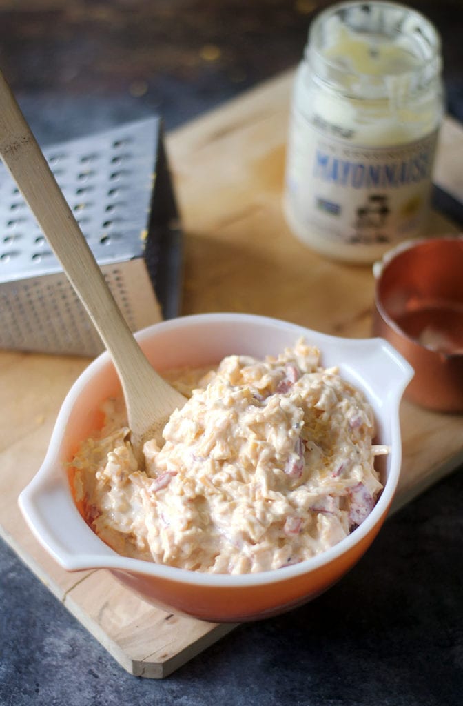 To make the pimento cheese, combine the mayonnaise, pimento, Worcestershire, grated onion, paprika, and cayenne in a medium mixing bowl. Mix to combine. Stir in cheese and cover with lid or plastic wrap. Chill until ready to use.