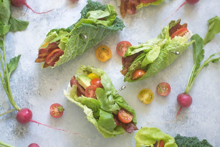 Some butter lettuce, mini-heirloom tomatoes, sliced avocado, and a little dab of pesto made the easiest and sort of healthy quick lunch. I ate them everyday last week. Come to think of it, that was maybe a bit too much bacon. I would even say you could *GASP* skip the bacon if you wanted.