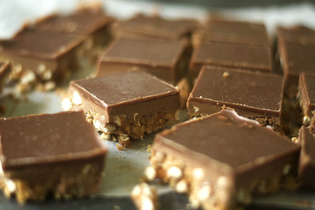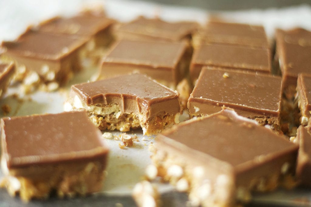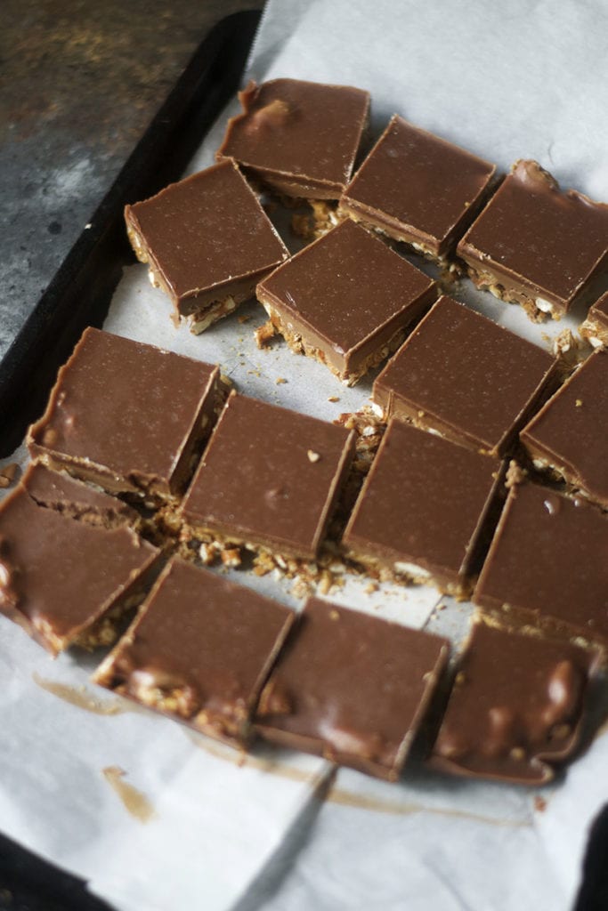 All you need is a microwave and a saucepan. Oh, and a candy thermometer. You gotta get that caramel layer right! I feel like I could eat just that crackly, crunchy caramel and pretzel layer. Hmmm… maybe I will.
