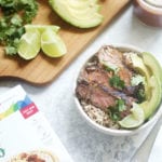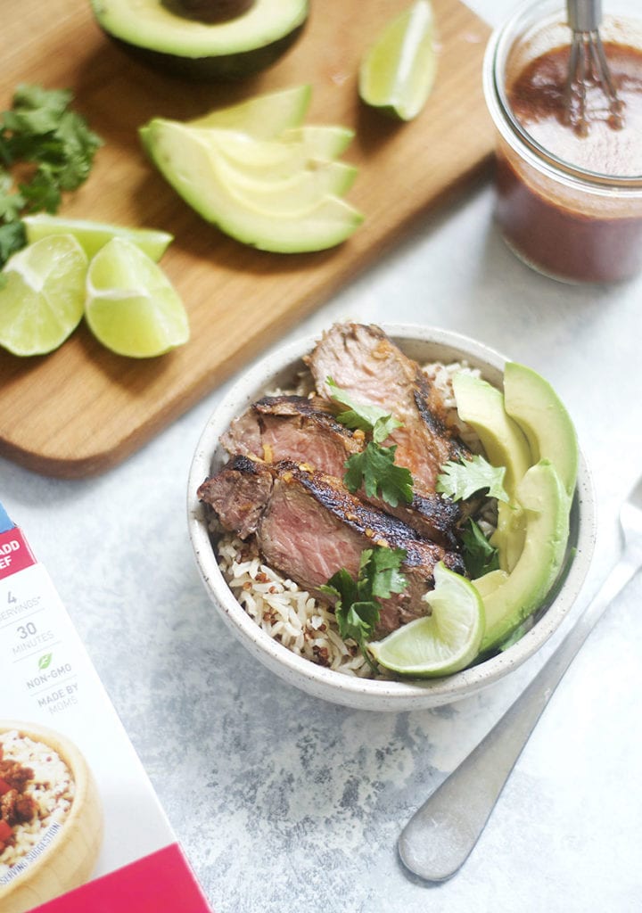 Slice Steak. Add steak slices to two bowls filled with the rice mix. Top with avocado, lime, and cilantro.