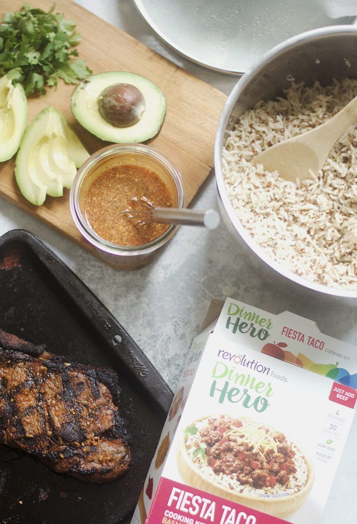 The meal kits take the guess work out of dinner. Provide you with the bare bones and instructions to make mealtime less stressful. All you have to do is add in a protein or veggie. No running out at the last minute for some spice you will only use once, then forget you already have it in your pantry next time you need it, and then inevitably run to the store to buy another jar of spices. #MomBrain