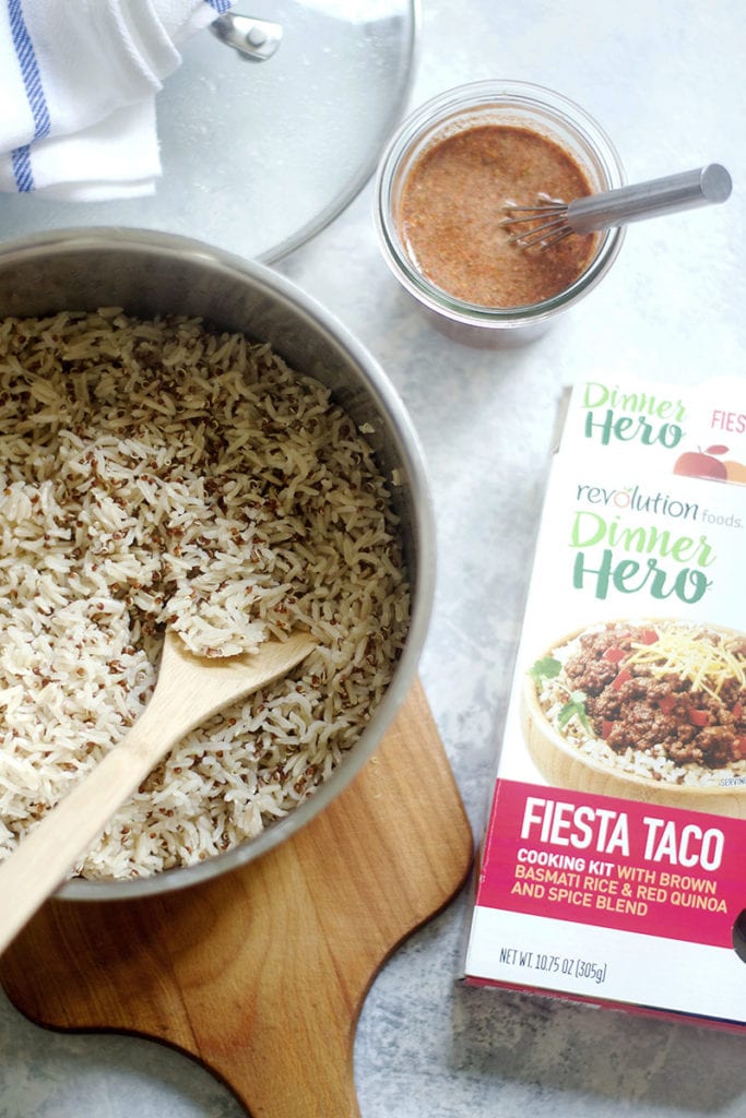 When I got home, I could not wait to bust into the kits. I went right for the Fiesta Taco kit because Taco Tuesday is a staple in our house. While I was cooking and naturally pausing to photograph for blog purposes, I noticed my little 3 year old sou chef appear and start taking an interest in the big pot of brown rice and quinoa.