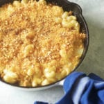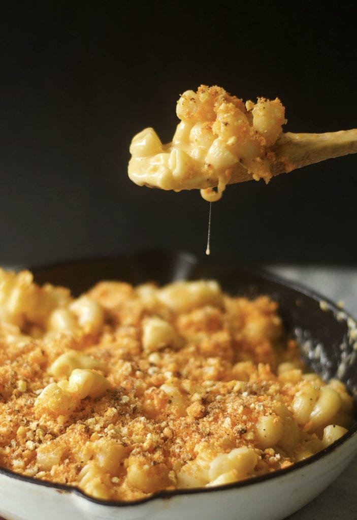 This recipe I did a little differently to take into account the fact that it was about 90 degrees and I didn’t want to heat up the upstairs too much for nap time. This mac is like a stovetop and baked mac hybrid. You cook the mac and cheese on the stovetop, transfer it to a big oven-safe skillet, top with ground Cheetos, and then stick it under the broiler for a few minutes just to toast the Cheetos. Done!