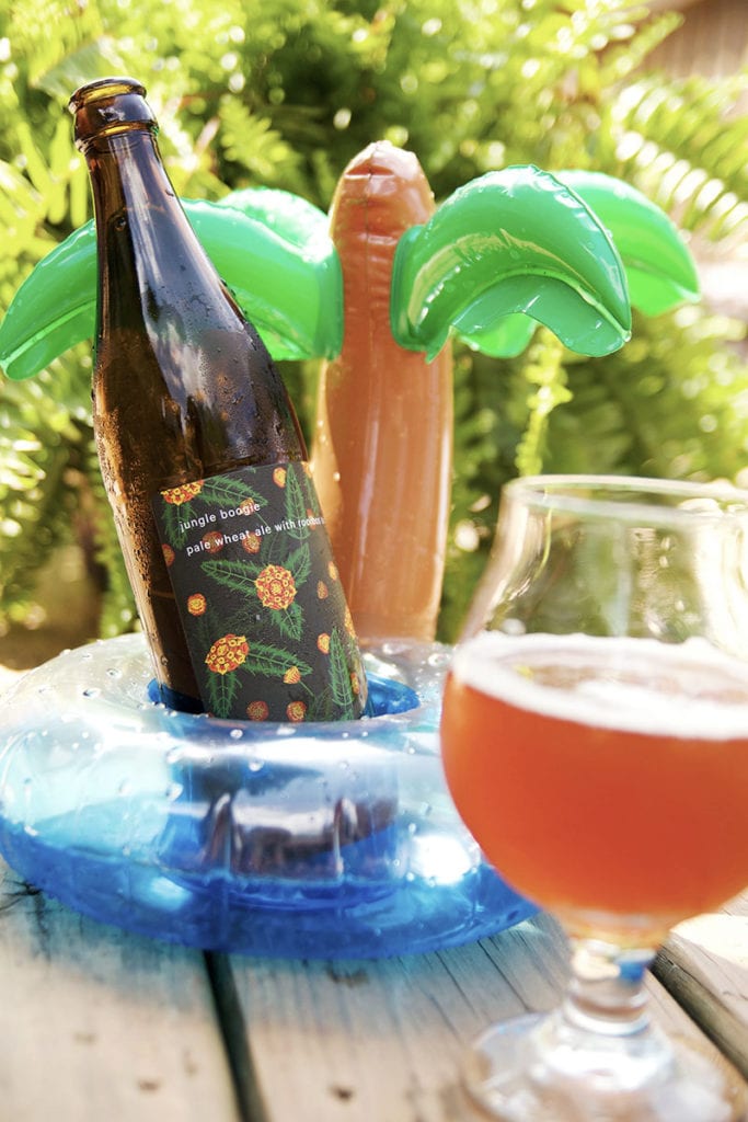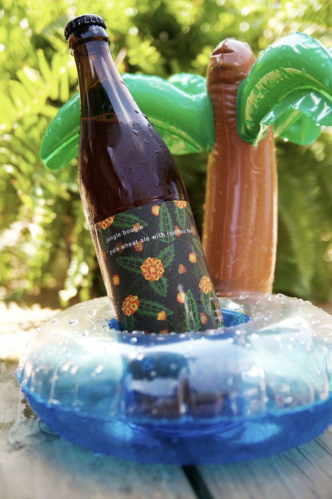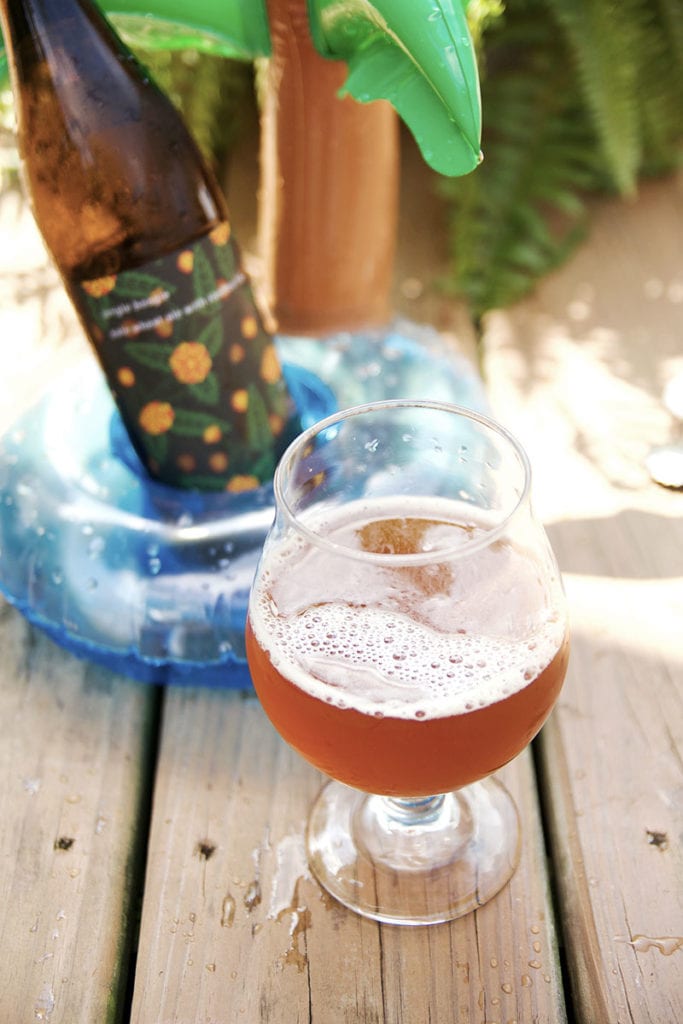 Jungle Boogie is a pale wheat beer with rooibos tea. It hits you in the nose with the smell of mosaic hops and the standard IPA smells. When you take your first sip, you definitely get a light wheat beer with almost a molasses taste. The rooibos tea adds that sweet and floral tang at the end. If you think you are too cool for a good wheat beer, try this and you will be proven wrong.