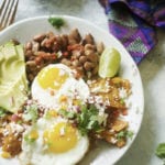 Once the eggs are cooked, divide the beans between 2-4 plates. Do the same with the chilaquiles. Add the eggs to the plates right on top of the chilaquiles.