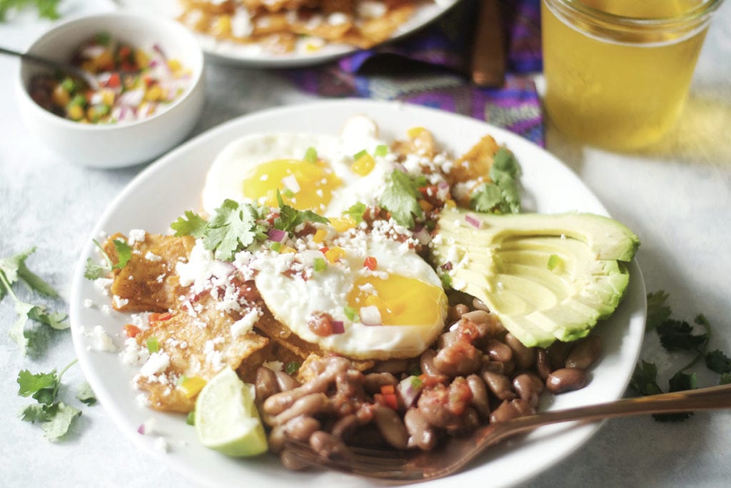 If I could have breakfast delivered everyday, it would be some sort of mishmash like this; chilaquiles, fried eggs, pinto beans, and homemade salsas. That’s it. It is simple, filling, and not too bad for you!