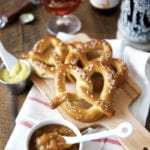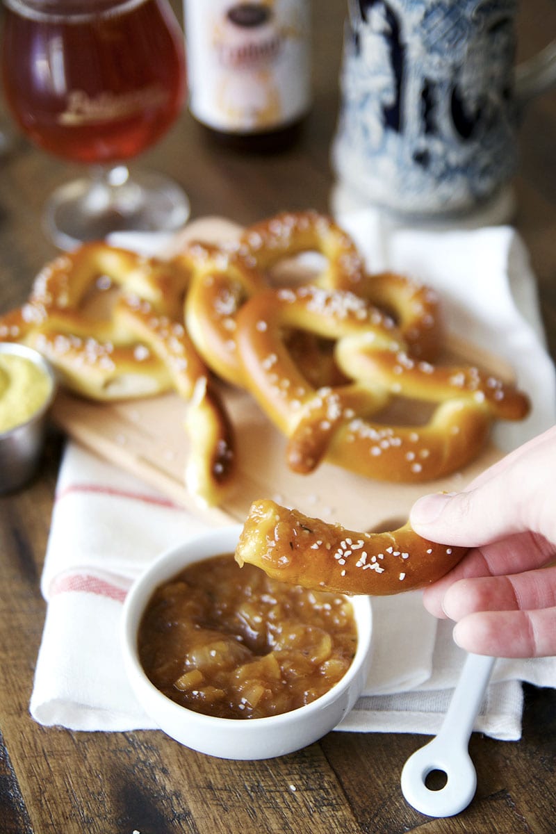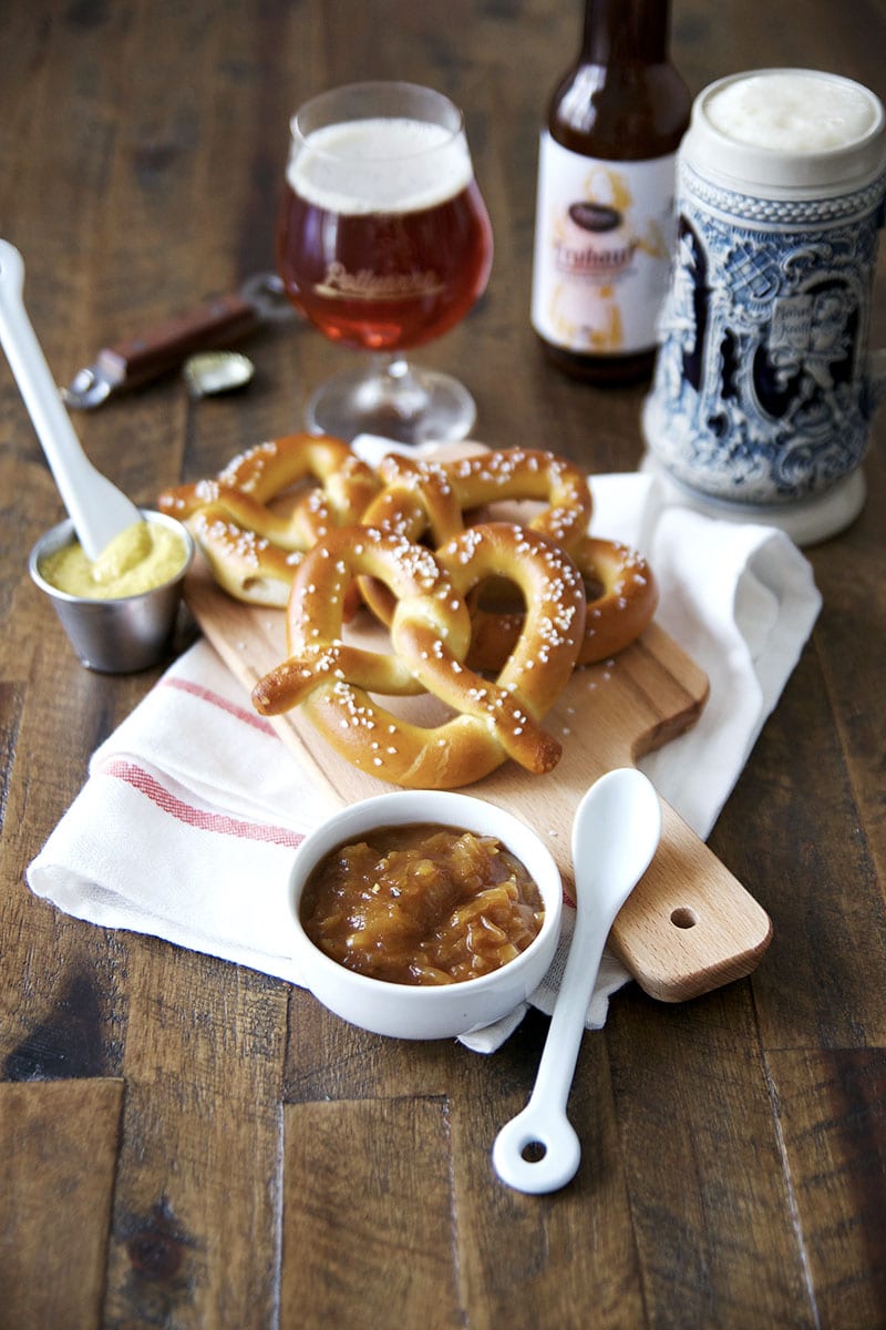 Since we will be celebrating 2 of the little nephews and my bro this weekend instead of polkaing and pretzeling, I started the party early with soft pretzels, mustard, and this Oktoberfest Onion Jam. You are going to love it! It is slightly sweet and beery with a little hint of thyme and horseradish. It is a perfect companion to spicy mustard. I even might make this to go on some brats or hot dogs since it is supposed to be in the 80’s. Fall who?