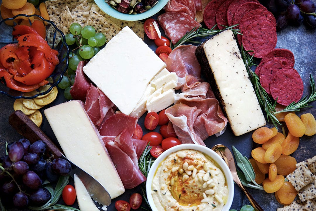 In the center is a classic prosciutto, capicola, cheese, cracker, and grape situation. It pairs perfectly with the fruity and creamy Montamoré Cheese. My favorite cheese board item is dried apricots–a huge hit with adults and kids alike, and wow, does it pop with the cheese. I even dress up a little store bought hummus with a drizzle of olive oil and a dusting of paprika. The more options the better.