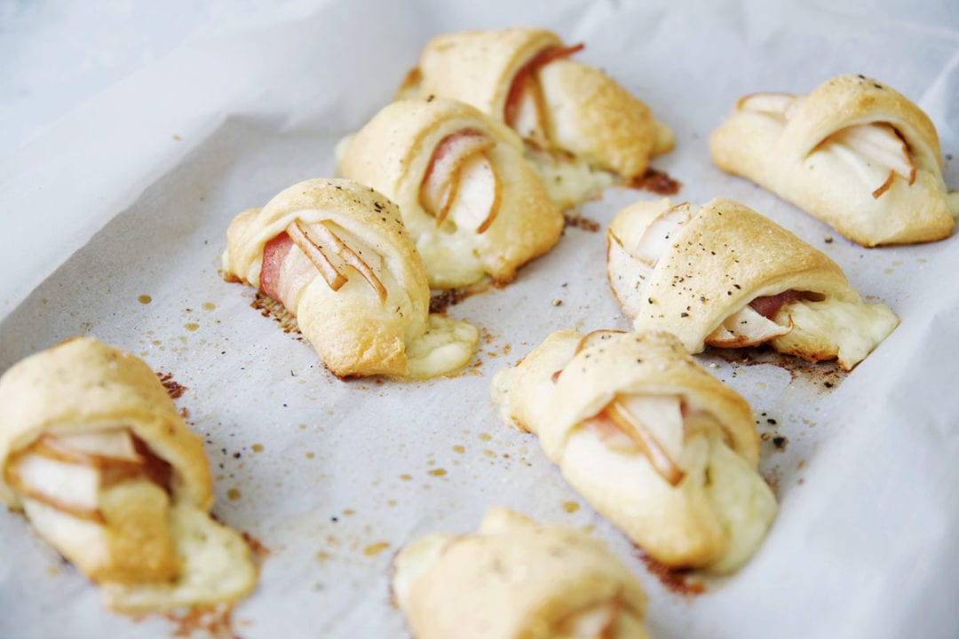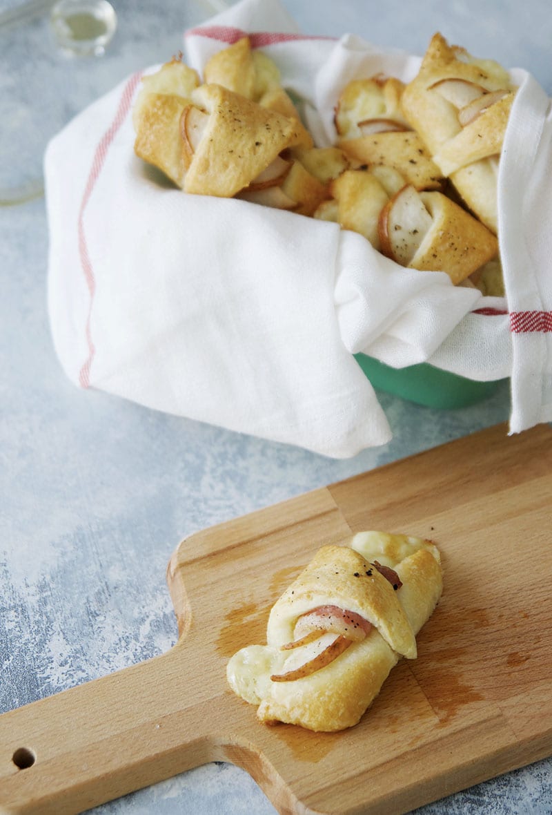 Roll out the crescent roll dough on the parchment paper lined baking sheet. Separate each triangle along the perforations. Add a slice of bacon to the triangle of dough. Top with brie cheese slice. Roll the brie inside the crescent dough. Before you do the final roll of the point of the triangle, tuck two thin slices of pear on top of the roll. Firmly pull the triangle over the pear slices and seal under the roll.