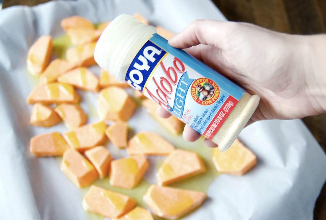 Add the sliced sweet potatoes to the other prepared pan. Drizzle with Goya Organic Olive Oil, about 3 Tablespoons. Sprinkle a little bit of Goya Adobo Light seasoning on top. Toss with your fingers to evenly coat. Arrange in one layer on the baking sheet.