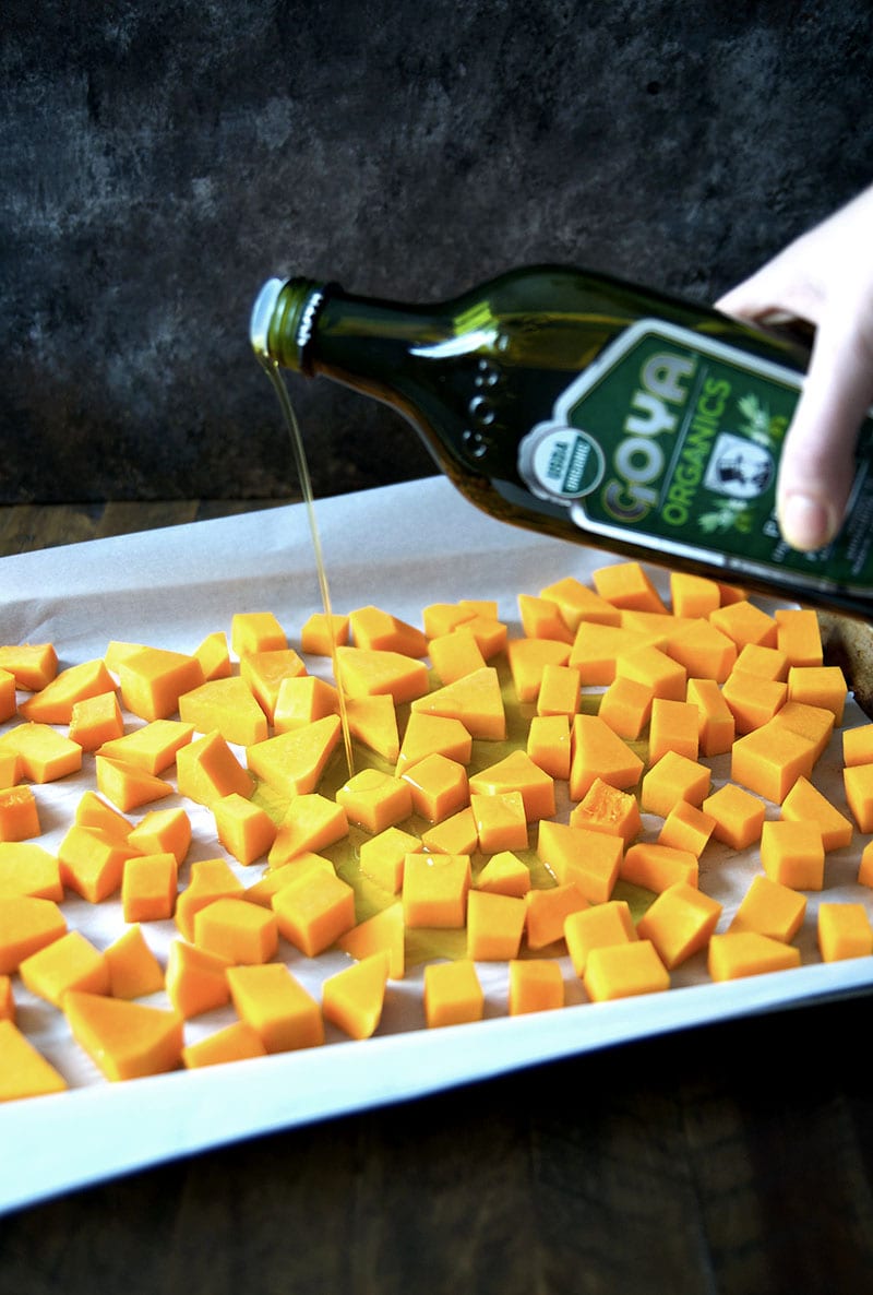 Add butternut squash to one baking sheet. Drizzle with about 3 tablespoons of Goya Organic Olive Oil. Then sprinkle the squash with a dusting of the Goya Adobo Light seasoning. Toss with your hands to evenly coat and then arrange in one even layer.