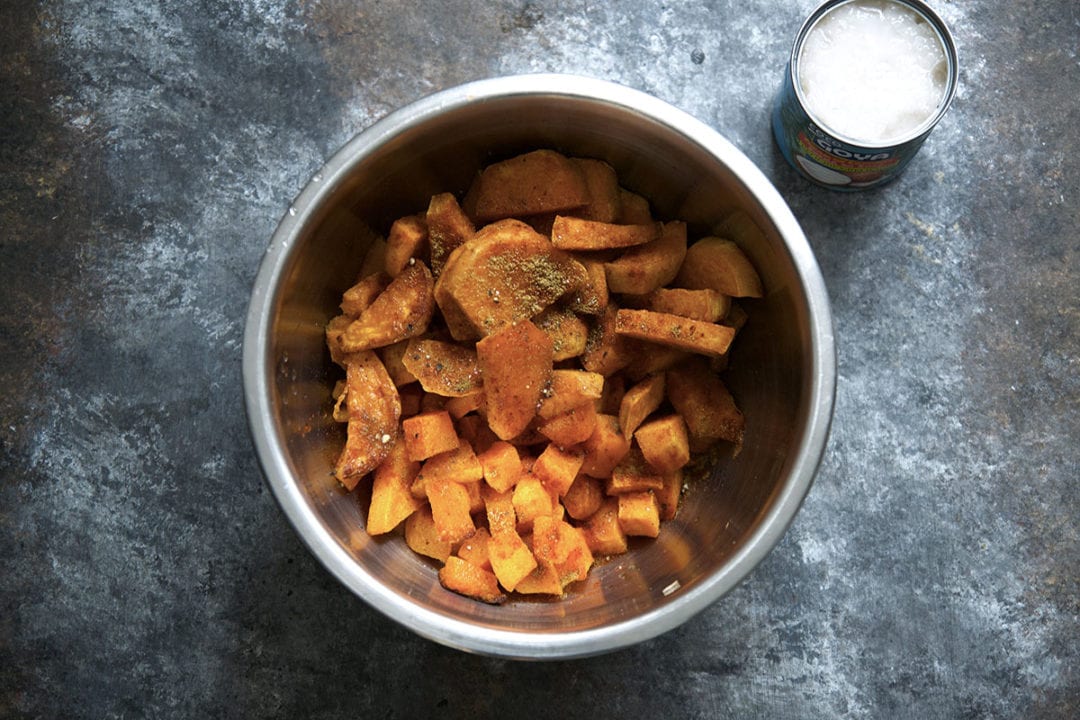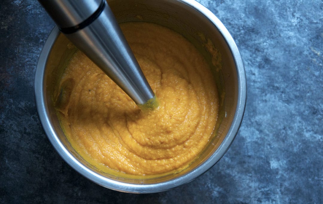 Add the squash and sweet potatoes to a large mixing bowl. Add the cream of coconut, paprika, cumin, and a little more salt and pepper. Use an immersion blender to puree the mixture until smooth and creamy.