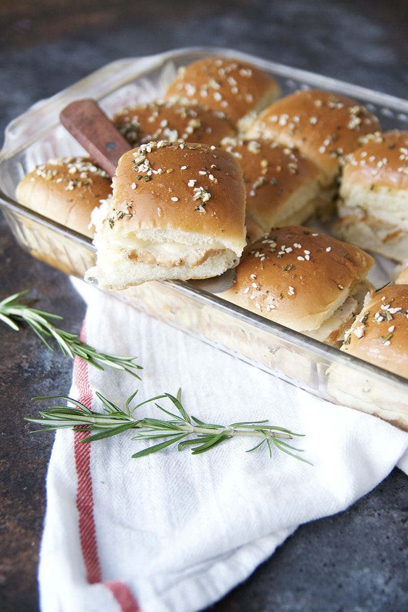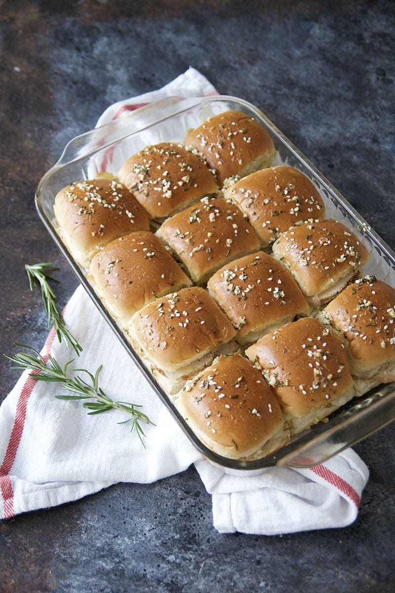 Cover the slider dish loosely with tin foil and bake for 10 minutes. Remove the foil and bake the sliders for 10 more minutes.