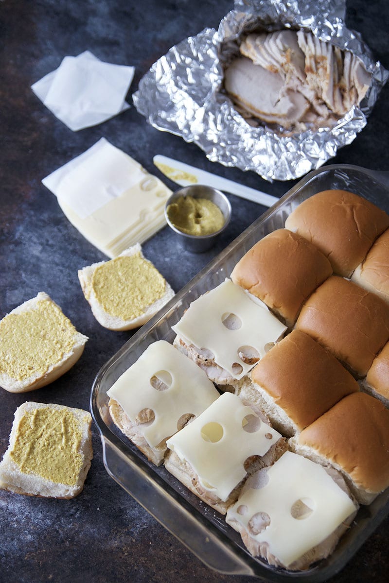 Arrange the bottom buns on a 9x13-inch baking dish or jelly roll pan. Lay out about 2 slices of turkey on each bottom bun. Follow up with a slice of Swiss cheese.