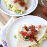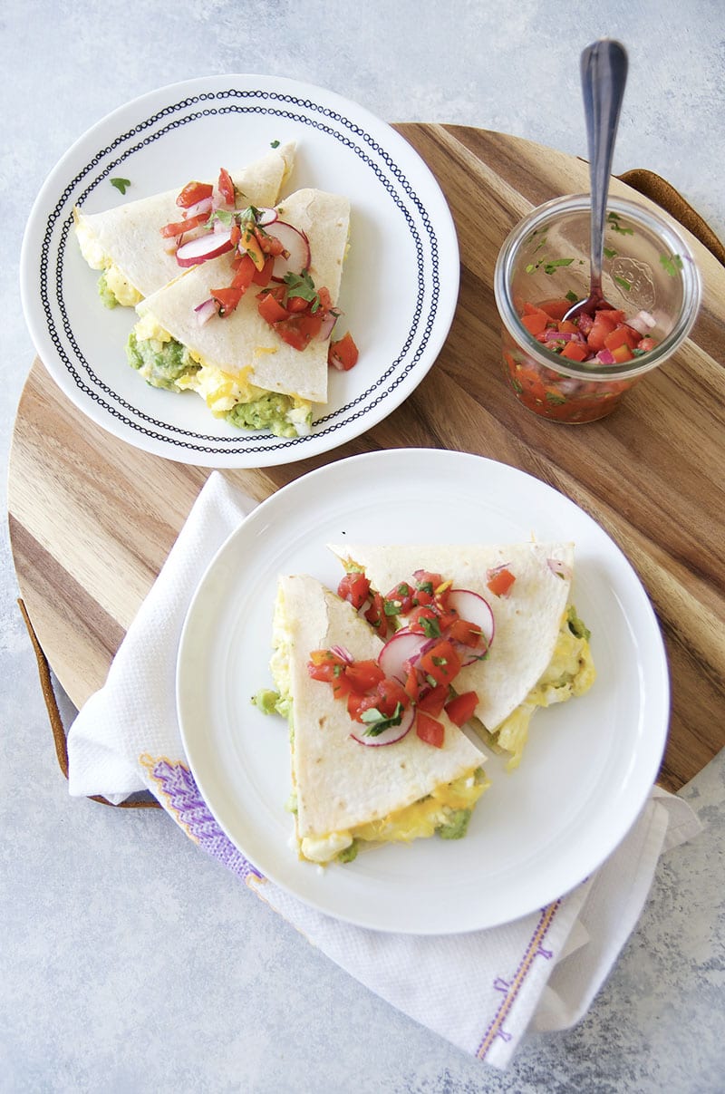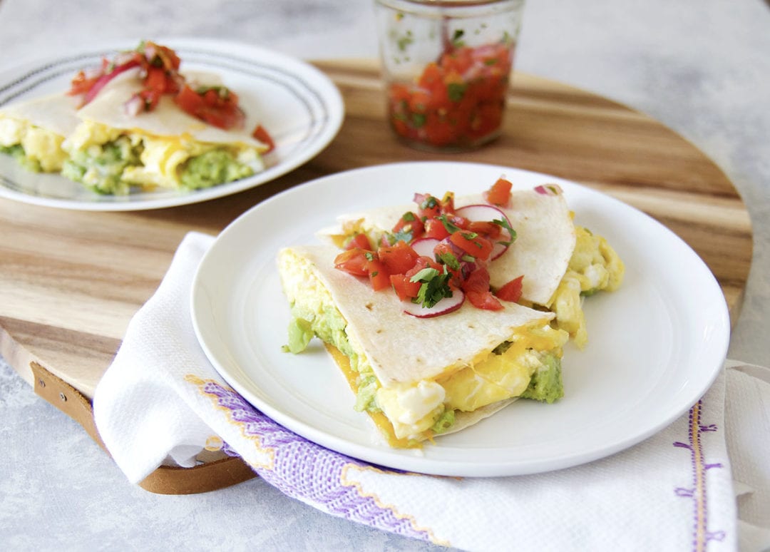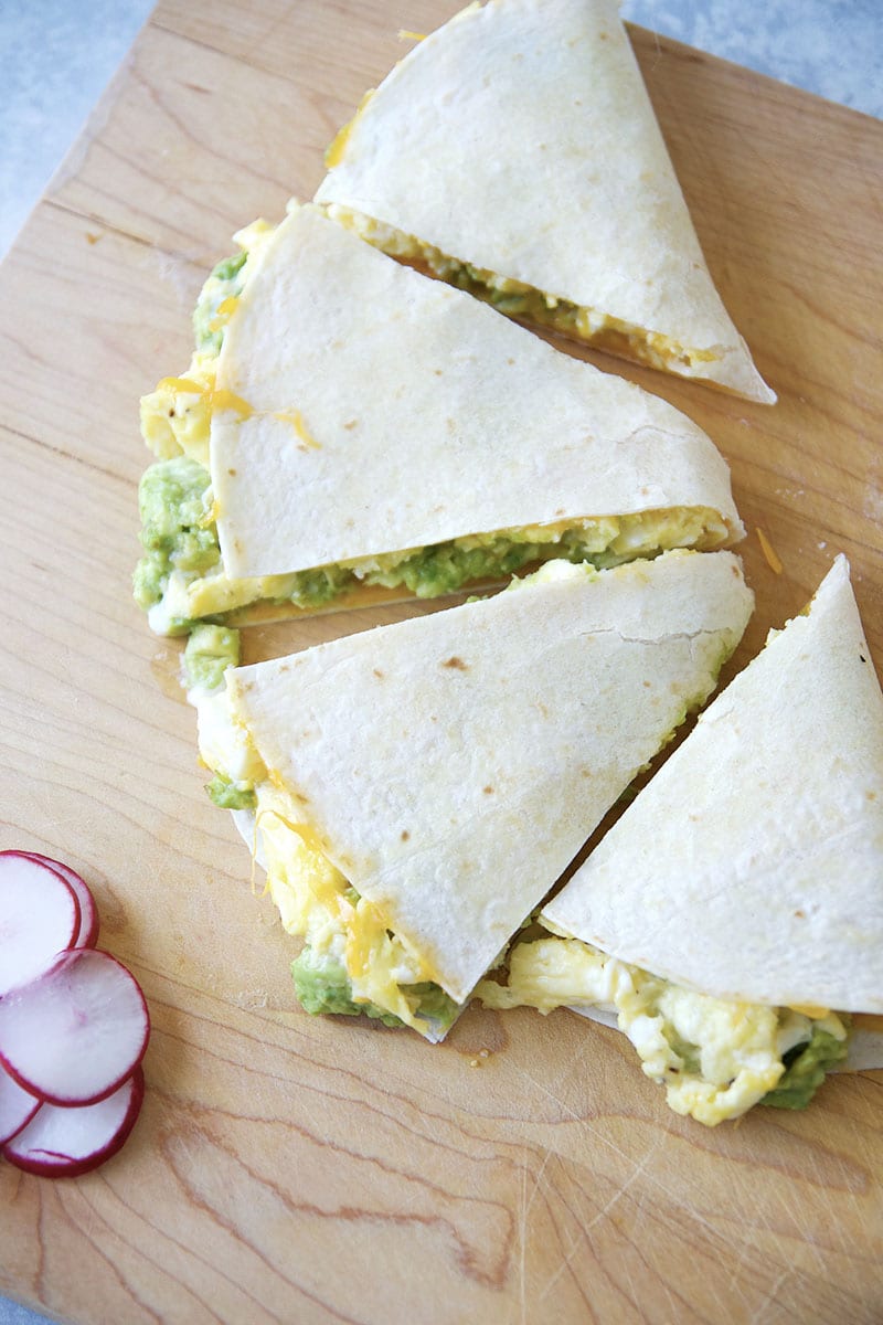 Quesadilla with a soft scramble, cheddar cheese and a smashed avocado. Done deal. These things make this the ultimate breakfast quesadilla in my opinion. It doesn’t need meat, maybe a dash of hot sauce or pico de gallo.