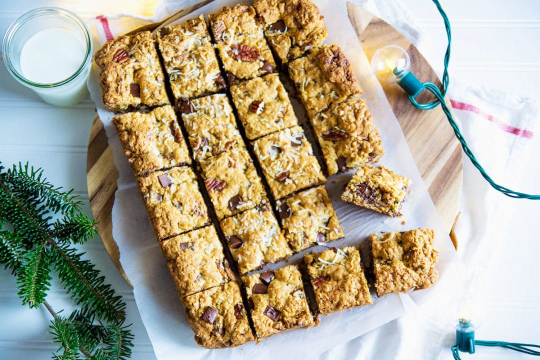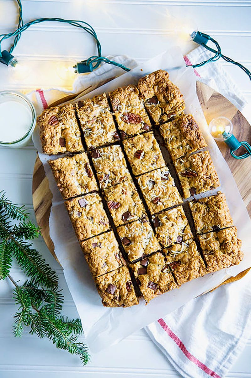 Lift the bars by the parchment out of the pan and move to a wire rack. Cool completely before cutting into 12-16 bars.