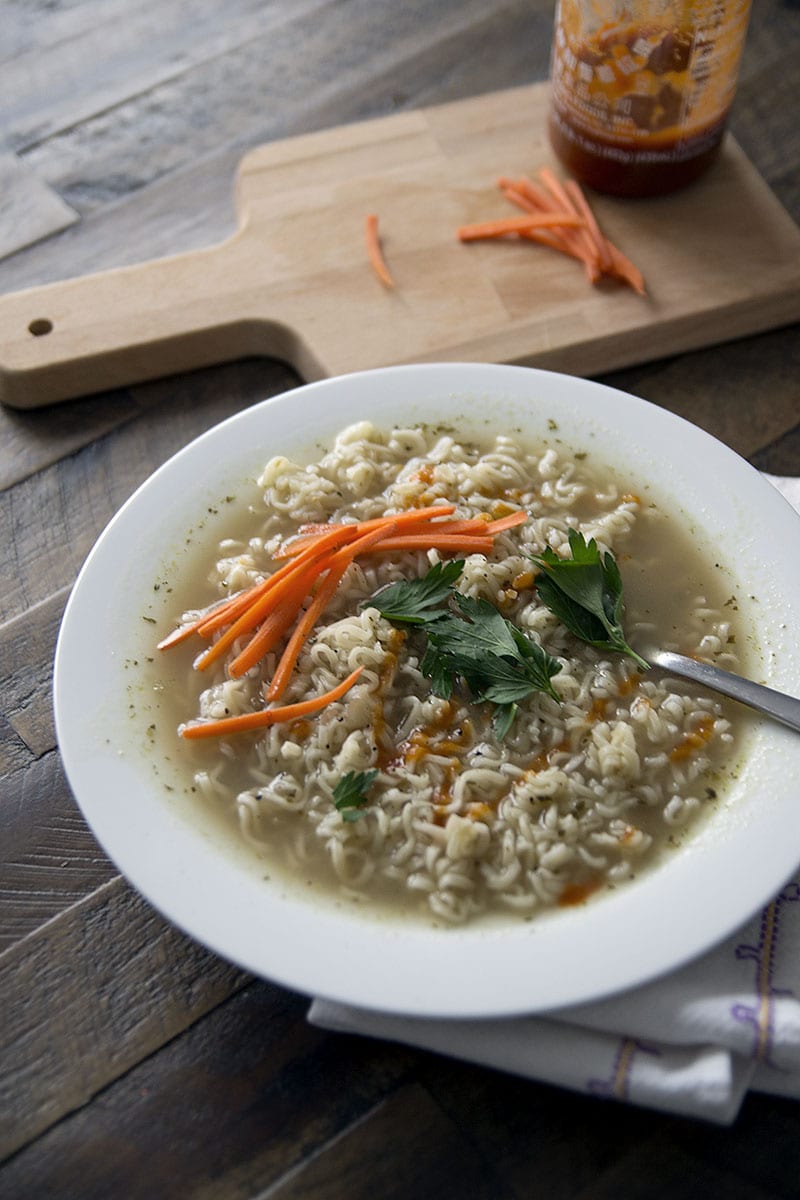 I know ramen is not the healthiest, but hear me out. I skip the seasoning package, use low sodium stock, and add in a lot of carrots and celery and whatever green things I do have on hand.