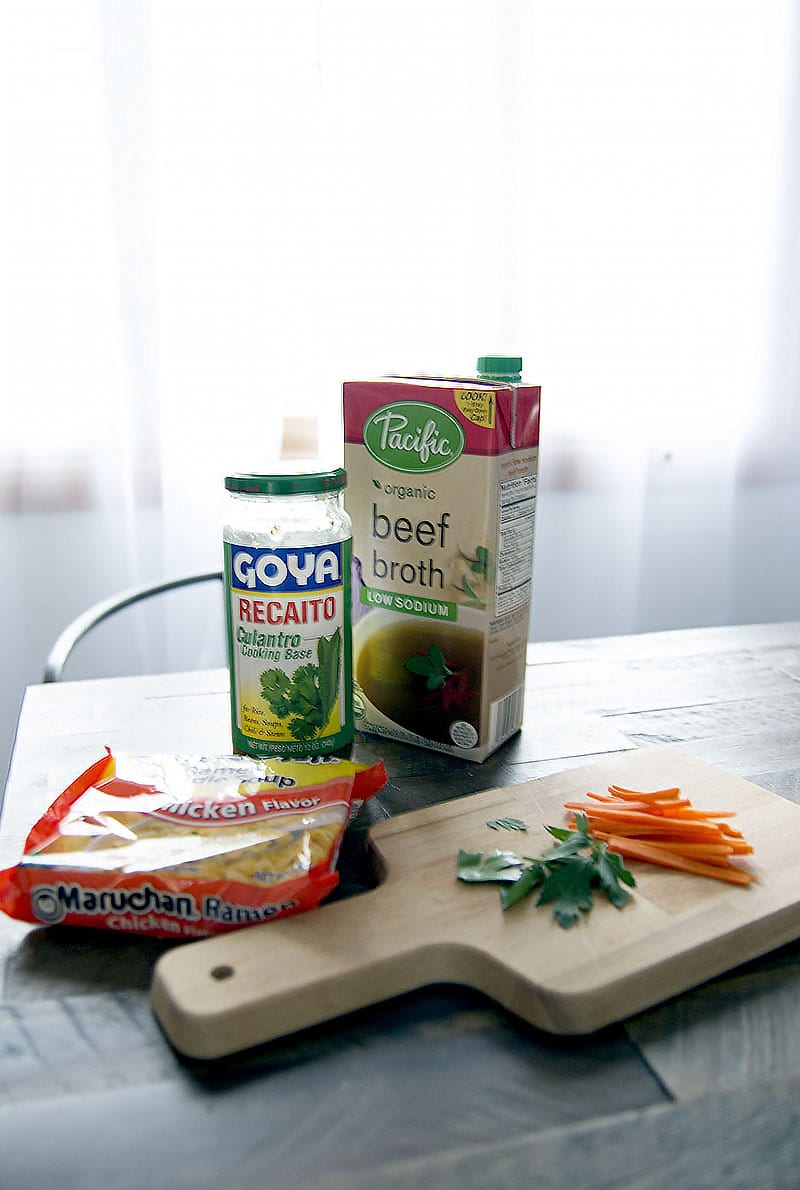 Crack the ramen noodles into smaller hunks and add them to the broth. Cook for 5-7 minutes until tender.