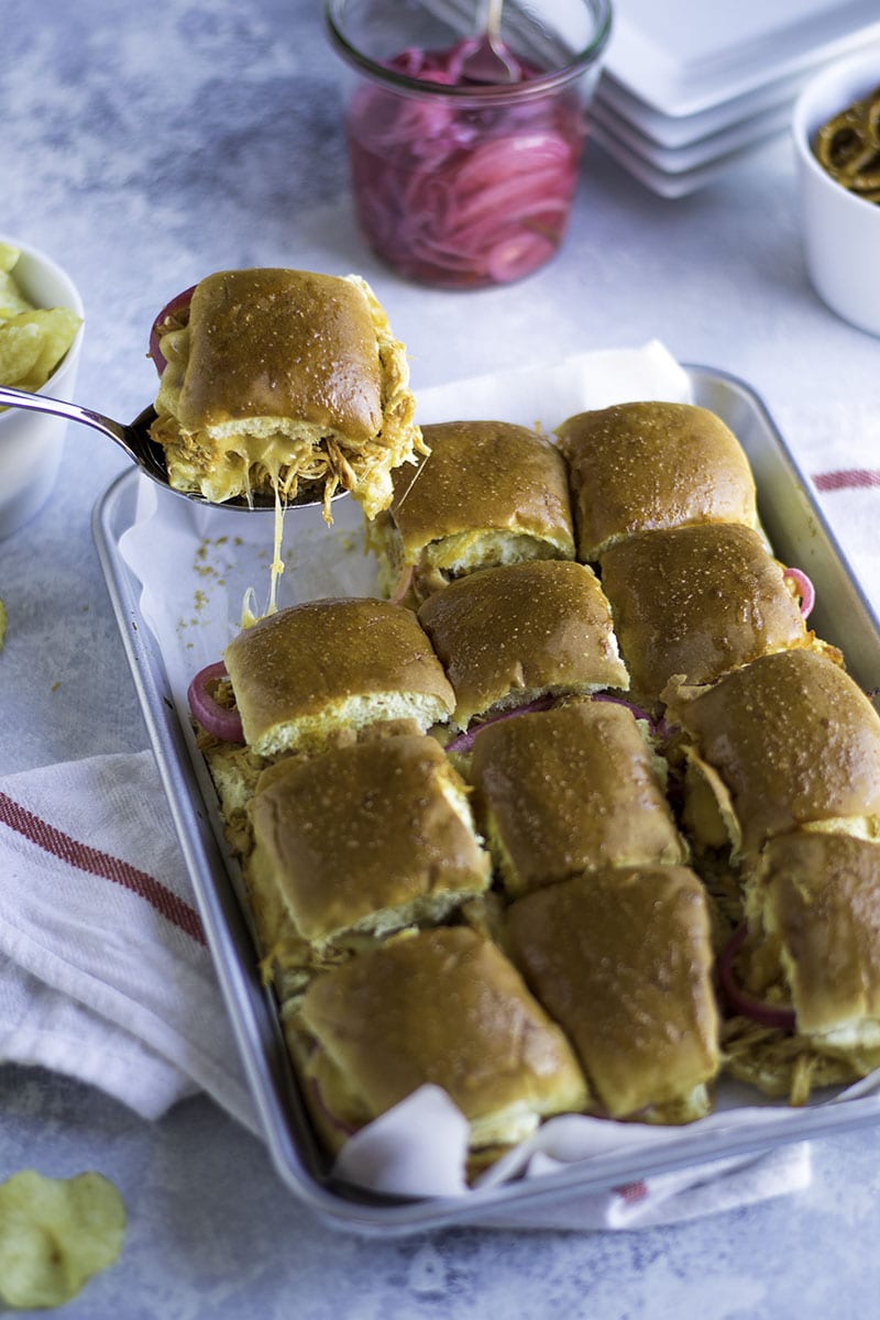 Place a big spoonful of the chicken on the bottom bun of each slider. Top with a few pickled red onions and two squares of gouda cheese. Cover with top bun.