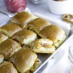 BBQ pineapple chicken sliders are spicy and sweet and can be made in the slow cooker or Instant Pot. Smothered with Gouda cheese and baked until melted.