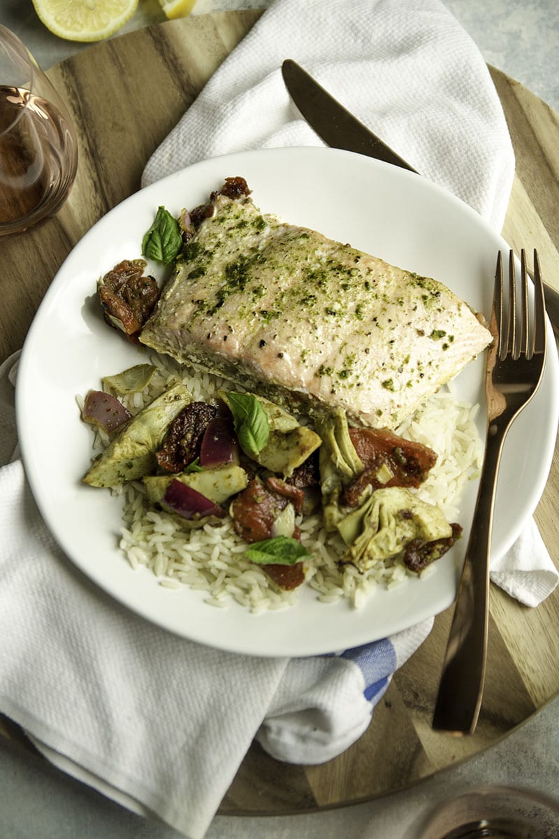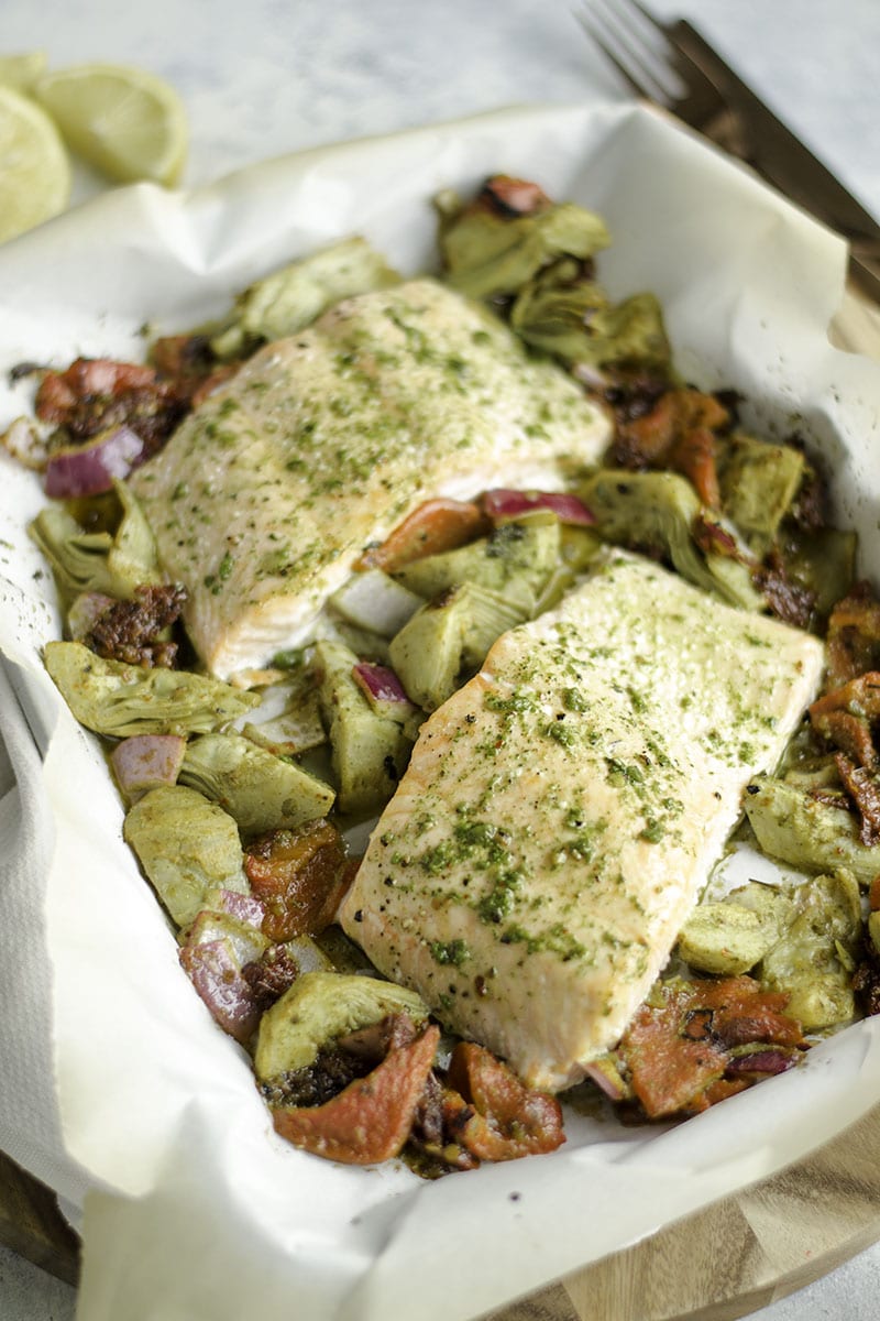 Sheet-pan spicy Mediterranean salmon and veggies is an easy weeknight meal. Roasted red peppers, artichokes, sun-dried tomatoes, onions, and salmon coated in spicy zhoug sauce and baked until tender.