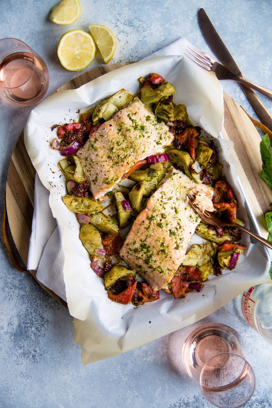 Bake for 15 minutes. If you want a little crisp on top of the veggies and salmon, pop on a high broiler for an additional 2 minutes.