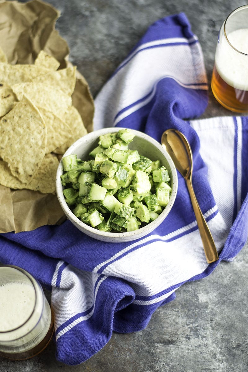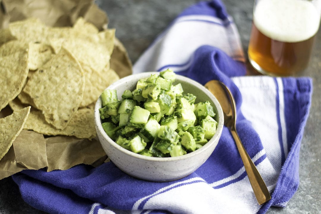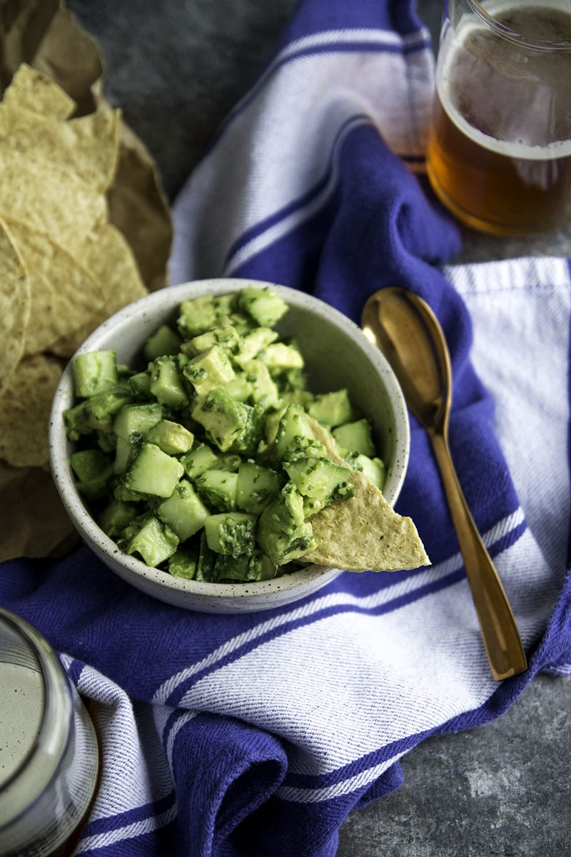 Easy avocado cucumber salsa is cool and crunchy. Persian cucumbers coated in avocado, lime, and spicy zhoug sauce. An easy appetizer or snack to throw together on a whim.