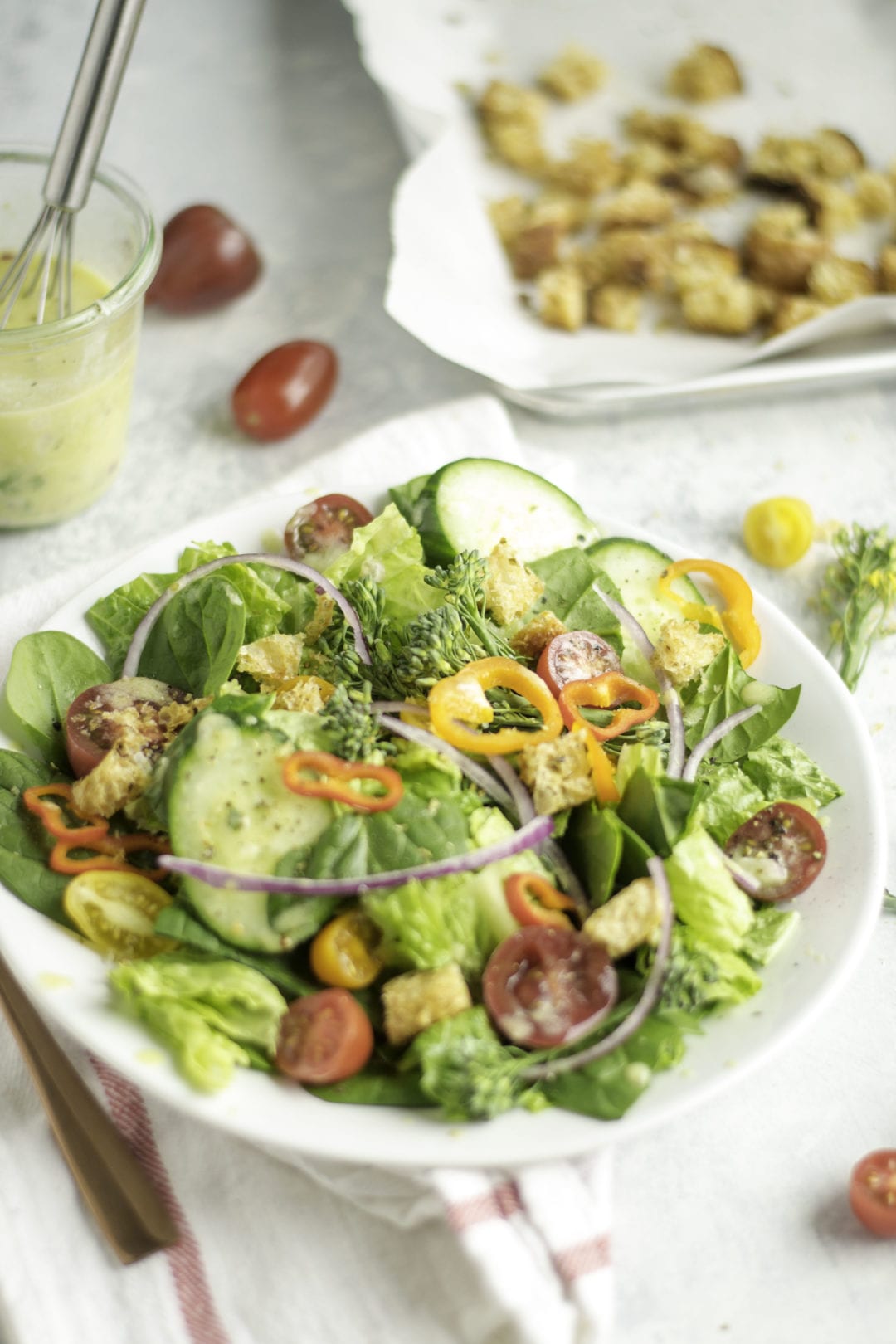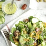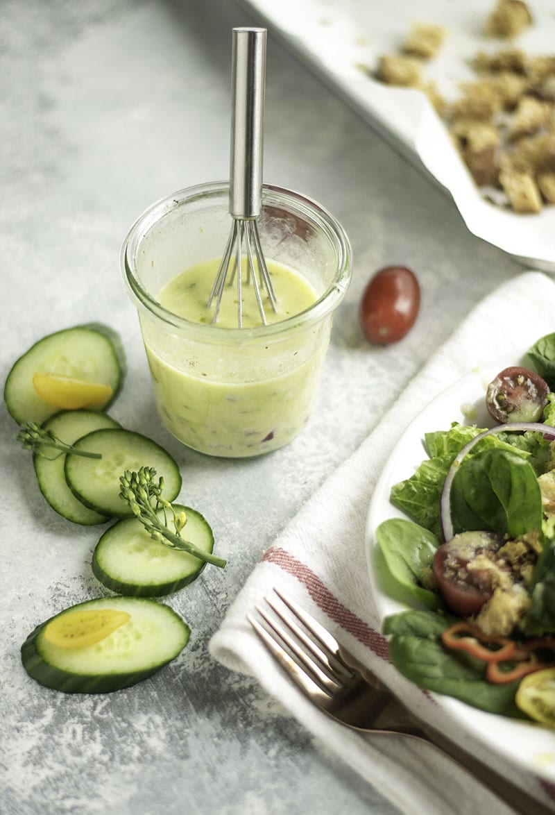 Creamy red onion vinaigrette is an easy fridge staple to add to house salads throughout the week. Creamy red onion vinaigrette is slightly sweet, herby, and Greek yogurt based.