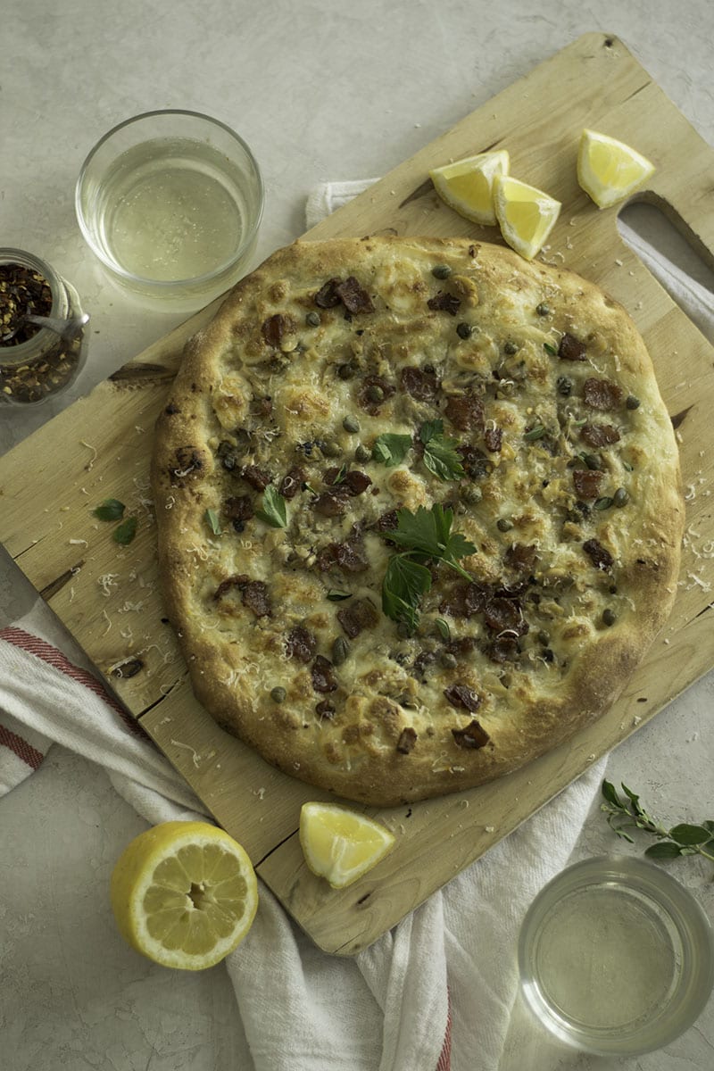 Stretch the pizza dough out to roughly 14 inches. Top with butter and garlic. Rip the mozzarella and cover the top of the pizza with cheese. Top with bacon, clams and capers. Transfer dough to the pizza pan or pizza stone.