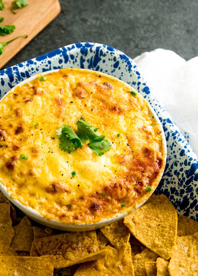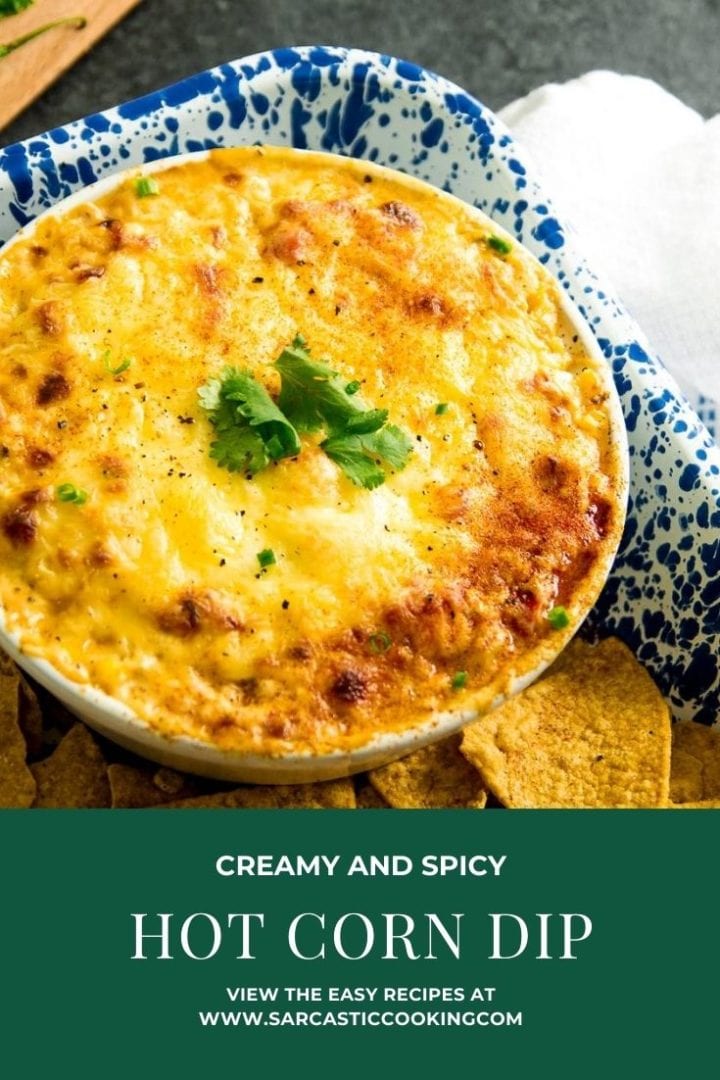 Hot corn dip is filled with tons of melty cheese, green chiles and bell peppers. This dip is perfect for a big backyard bbq or a chill night of tv watching. Hot corn dip is delicious from gooey center to the crusty, golden edges.