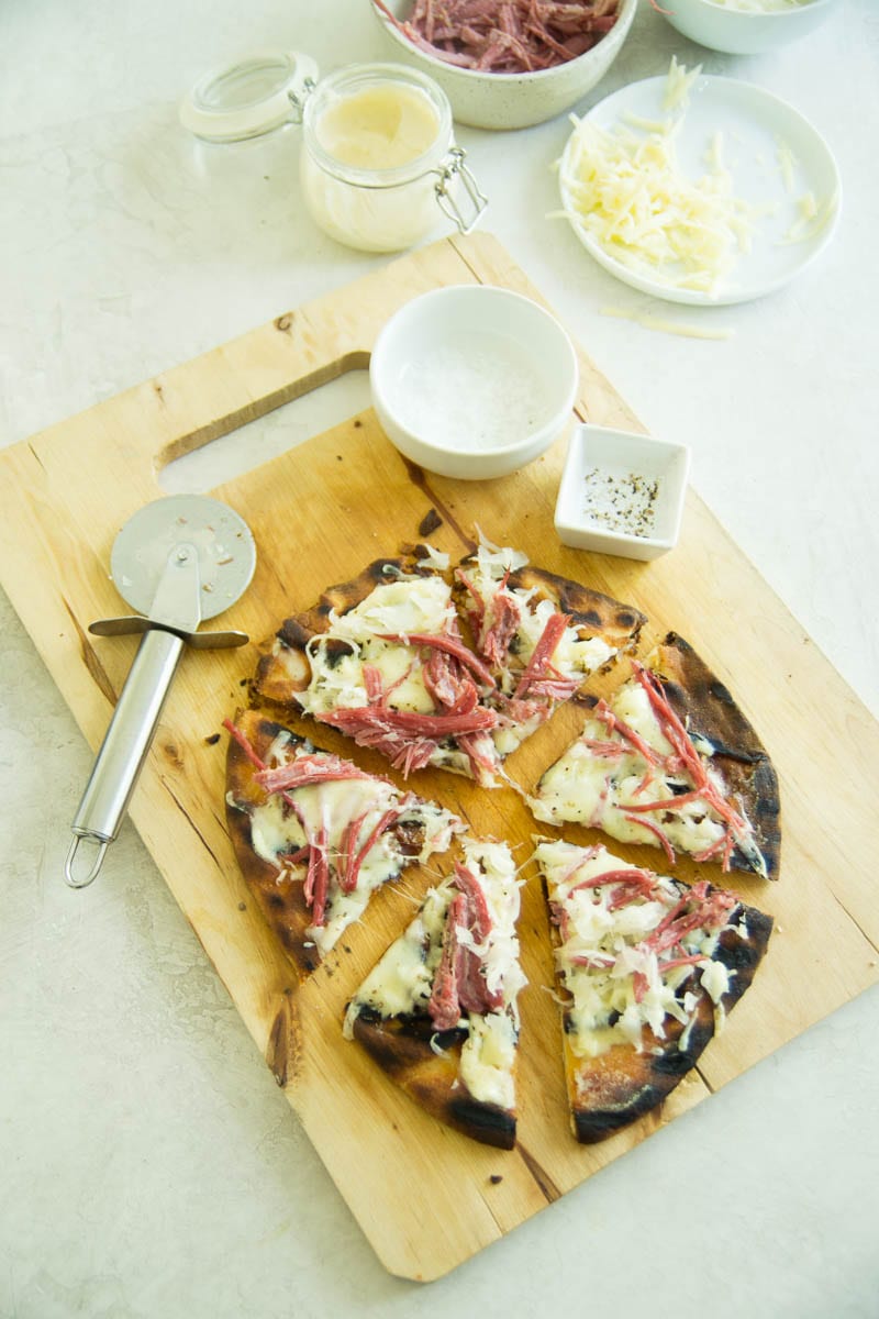 - Top the grilled side of the flatbread with a little bit, about 2 tbsp, of the horseradish mayo, the corned beef, sauerkraut, and then the cheese.