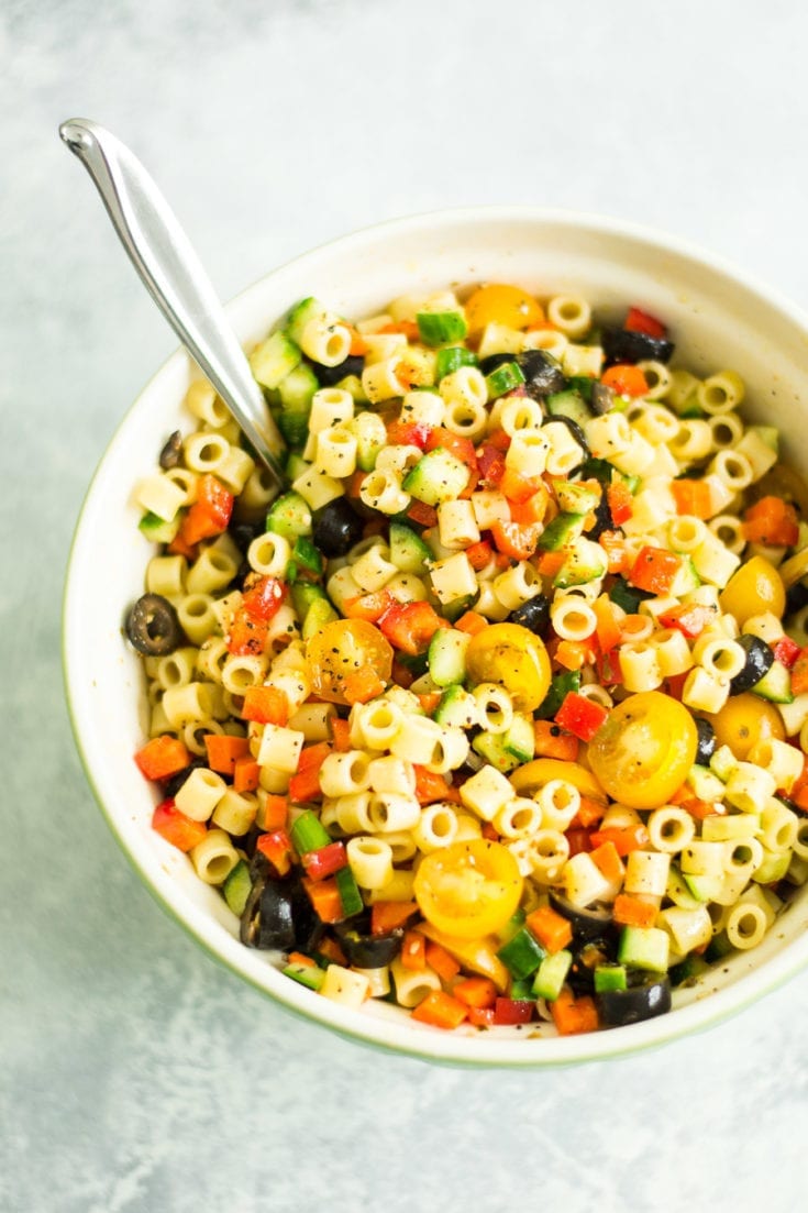 Diced garden vegetables with ditalini noodles tossed in a basil vinaigrette for a fresh summer side dish.