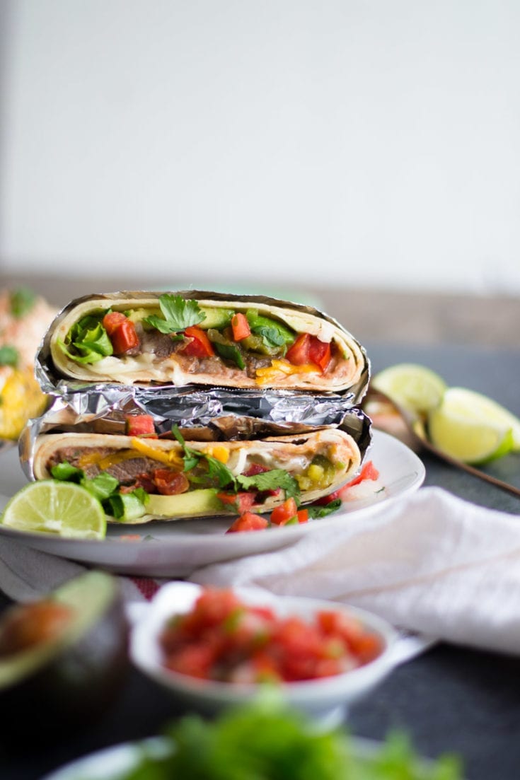 Beer, lime, garlic marinated skirt steak seared and sliced up thin wrapped inside a big tortilla with all the fixings!