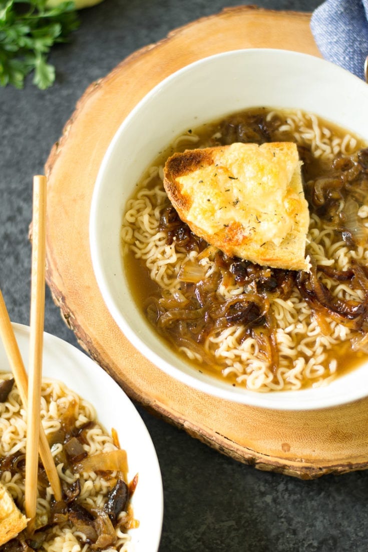 Cozy French onion soup flavors with big slurpy ramen noodles.