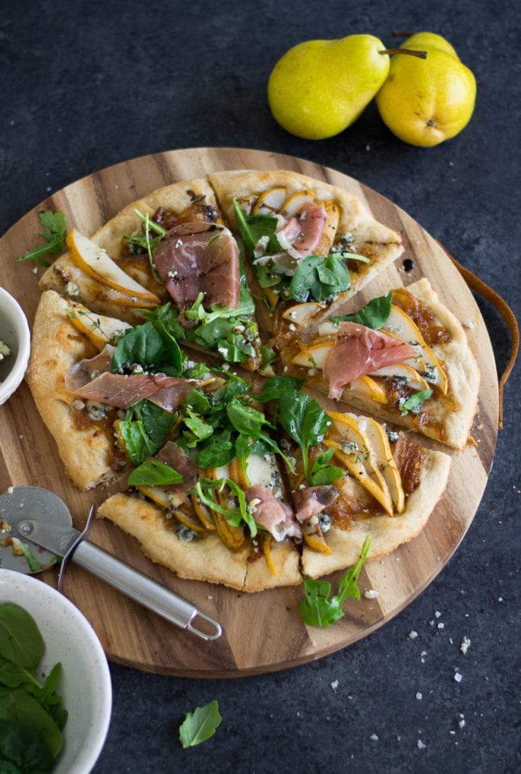 Apple cider caramelized onion pear & blue cheese pizza is the best seasonal pizza. Tender pears with zesty, sweet caramelized onions, and creamy blue cheese topped with baby greens and prosciutto make for one unique pizza.