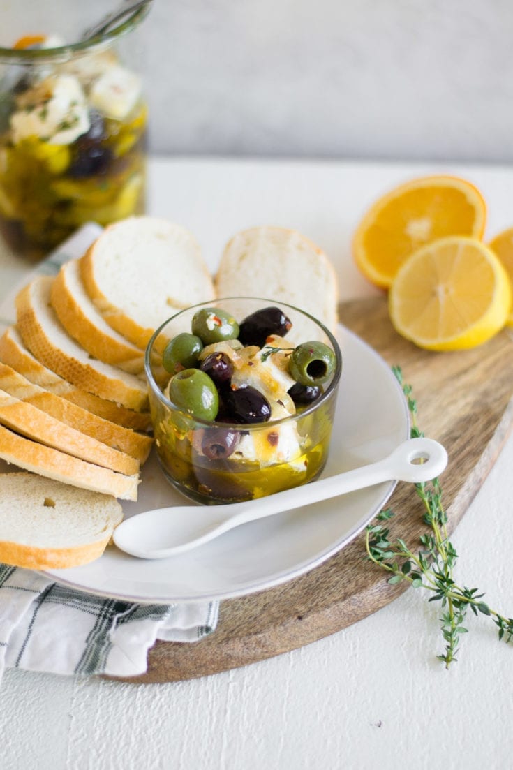 Looking for a last minute holiday hostess gift or appetizer? Citrus marinated feta and olive are perfect. Olive oil garlic, herbs, and lots of fresh lemon and orange peel make the perfect marinade for feta and olives.