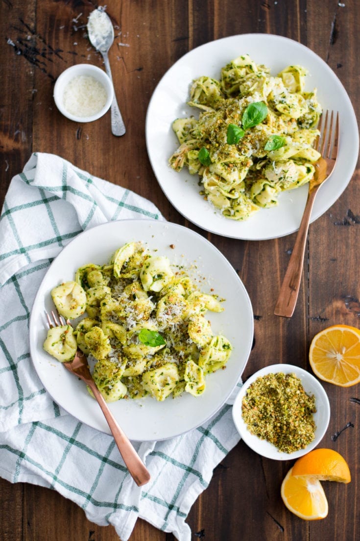 I really like to use a simple cheese tortellini for the pesto. If you are dairy-free, try this pesto over some spaghetti. For a little extra crunch on top I smashed up some breadcrumbs, pistachios, basil, and lemon zest.
