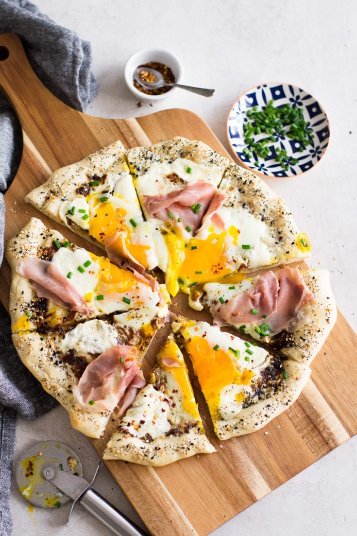 Everything bagel breakfast pizza is topped with caramelized onions, eggs, prosciutto, fresh mozzarella, and cream.