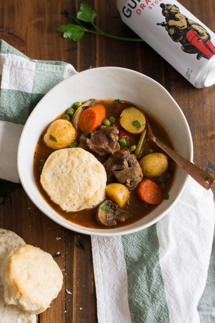 Guinness and beef stew meat along with mushrooms, baby potatoes, peas, carrots, celery, and onion make for one hearty St. Patrick’s Day themed meal. It’s so good I dare say you may even make it more than once a year.
