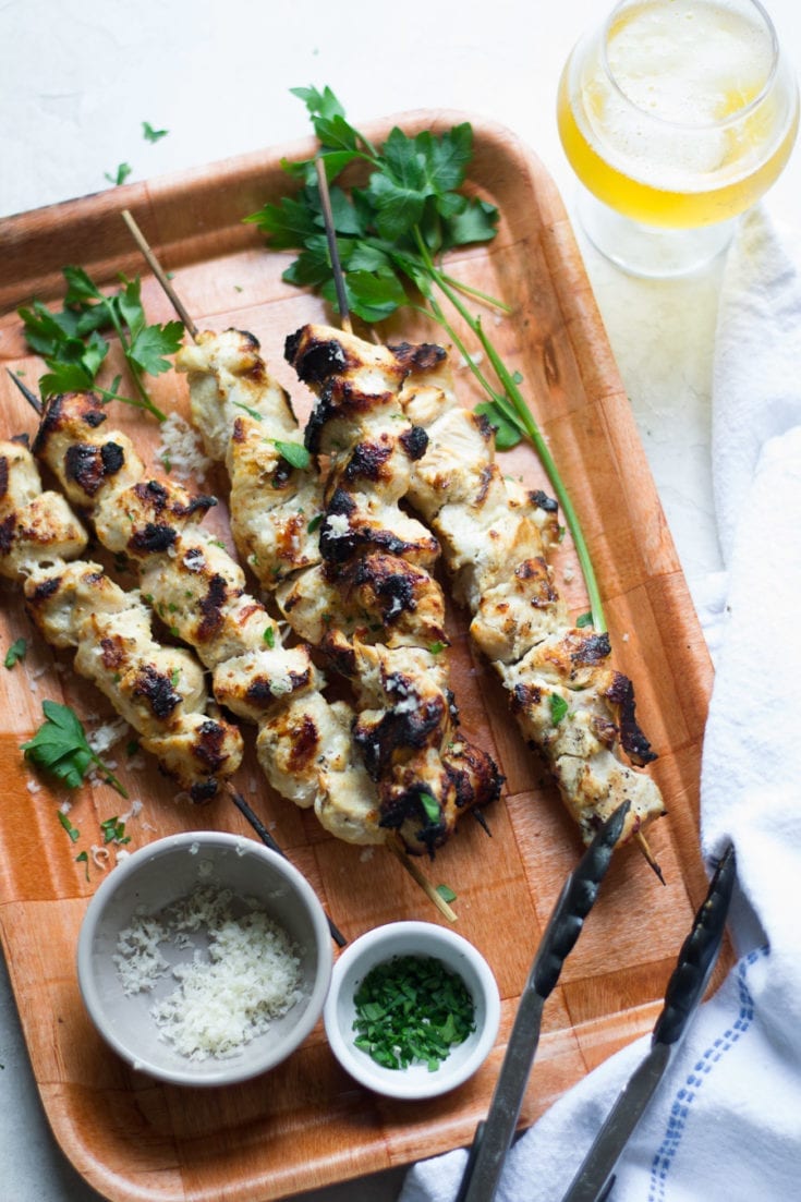Garlic, parmesan, Greek yogurt, and olive oil marinated chicken breasts grilled on skewers. Simple and delicious!