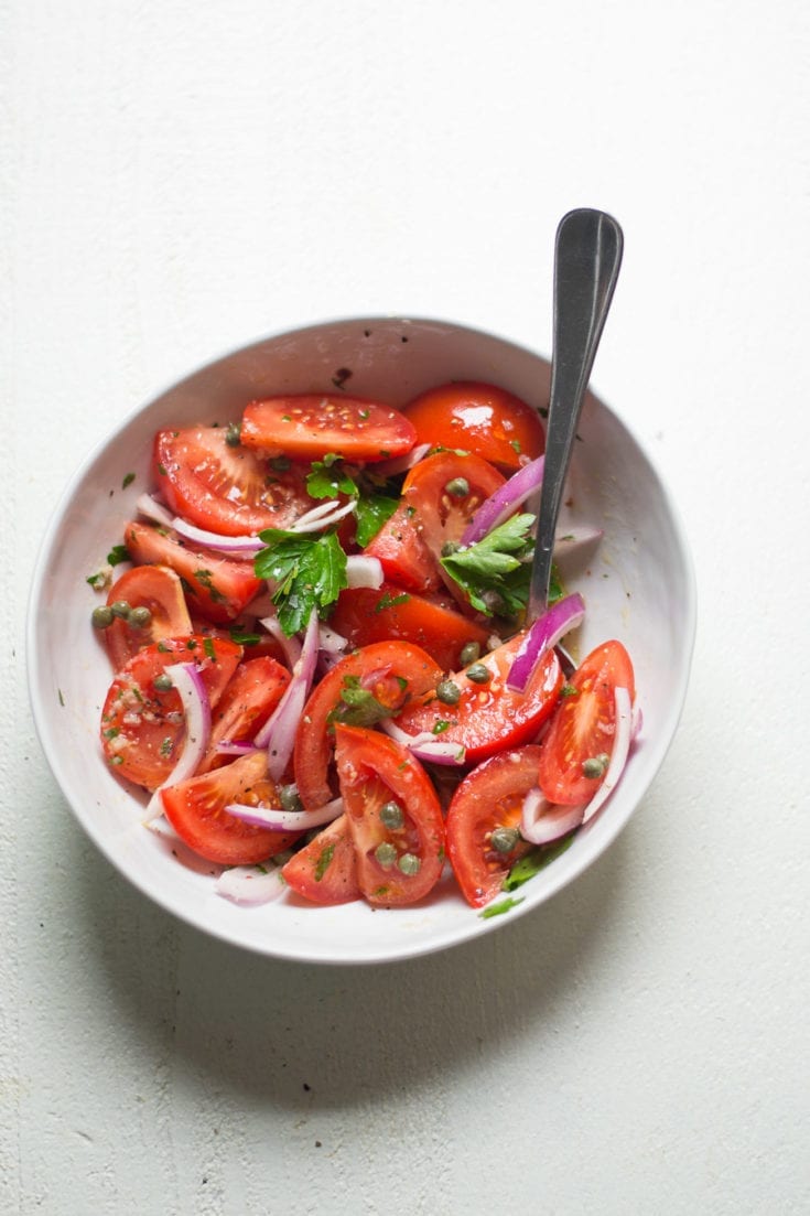 The tomatoes, onions, and capers all play so nicely together that you don’t even need much vinaigrette or dressing. Serve this as a side for a BBQ, a salad for lunch or dinner, or even better, serve it over some simply grilled chicken or pork chops.