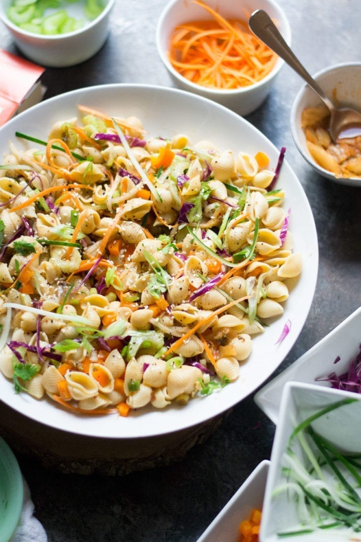 - Add the cooled and rinsed noodles to a large serving/mixing bowl. Add all the vegetables and sauce. Mix to combine.