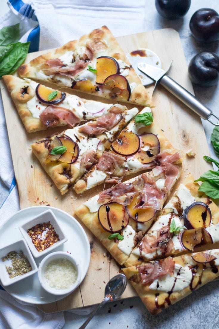 Baked or roasted plums got me thinking that the sweetness would be perfect on top of a crispy pizza crust. Plum, prosciutto, and mozzarella pizza is like your favorite summertime charcuterie board, just on a pizza crust.
