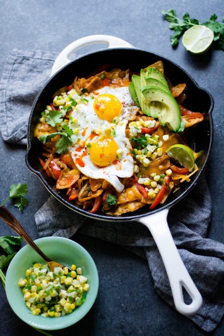 Fajita vegetable skillet chilaquiles has all the smoky makings of good fajitas. Then we took it up a notch with the addition of enchilada red sauce, tortilla chips, and just a dash of cheese. Top it with a little guacamole or fried eggs and you’re set with a meal in under 30 minutes.