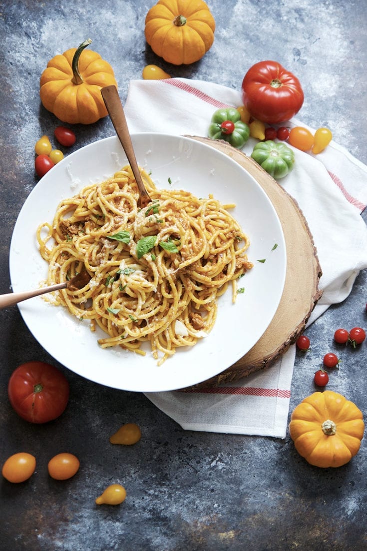 Seasonal autumnal alfredo made with butternut squash, pumpkin, cream, and lots of parmesan cheese.