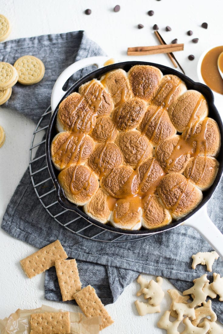 Layers of melted chocolate, apple cider caramel, and toasted marshmallows make the most perfect smore's dip for fall.