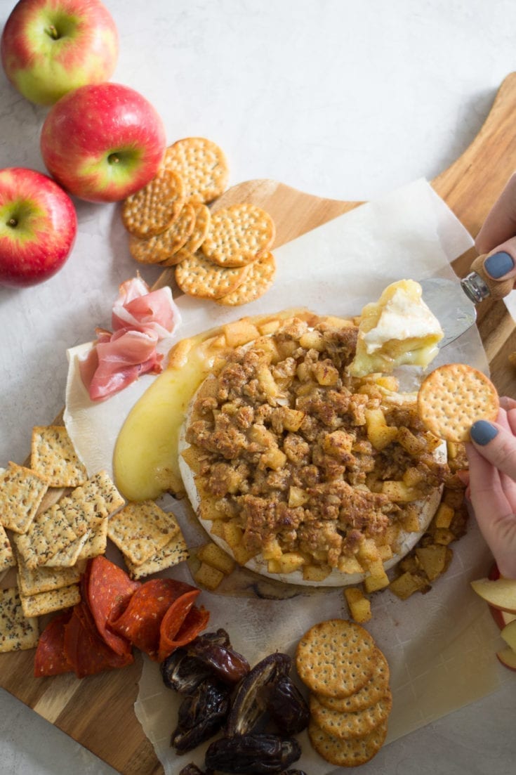 Baked brie topped with a crispy, sweet, warm apple crisp topping. The perfect holiday appetizer.