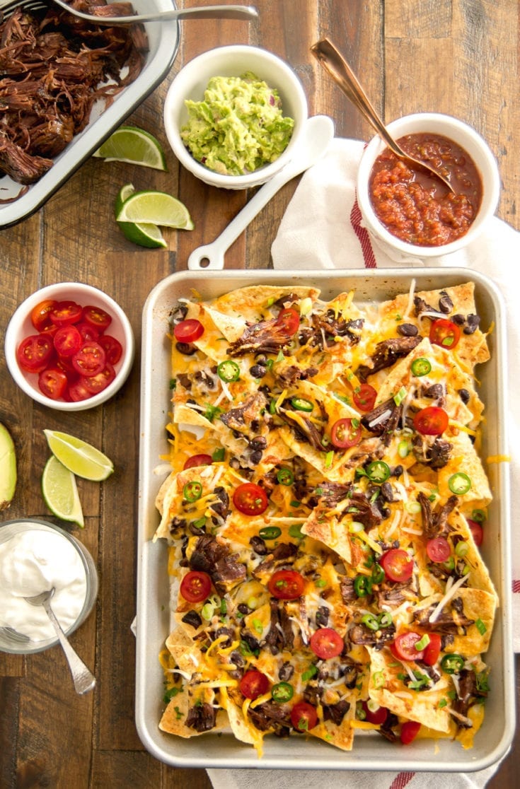 Instant Pot bourbon pot roast ina sweet, spicy, bourbon sauce shredded and served over chips with melted cheese and all the fixins!
