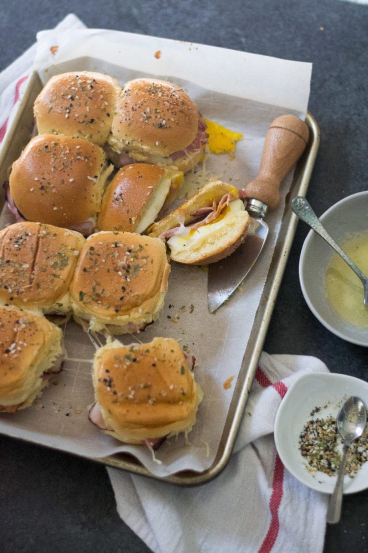 Baked ham and Swiss cheese sliders with spinach, spicy mustard, and everything bagel seasoning.