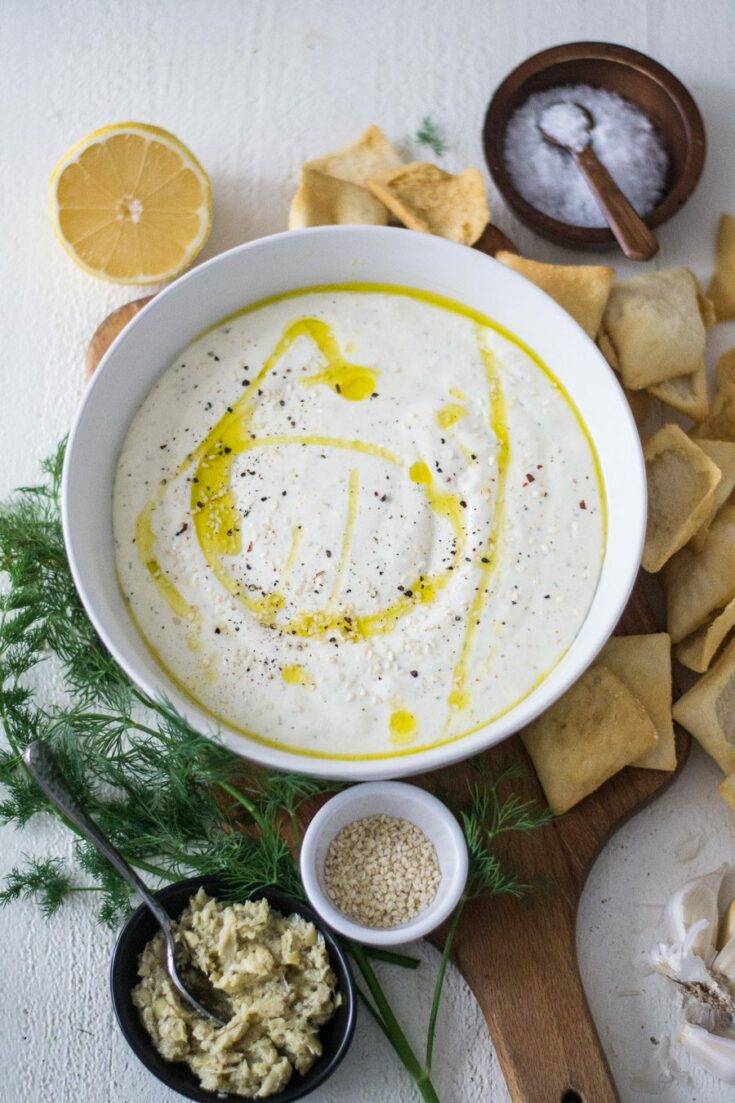 Easy whipped feta is made in the food processor with lemon, garlic, dill, oregano, mayo, and sour cream.